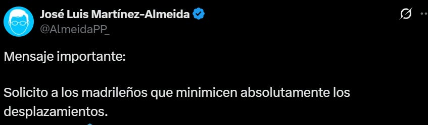 The Mayor of Madrid, José Luis Martínez-Almeida, issued an advisory asking people to stay safe, minimize commuting, and, if possible, stay off the roads.