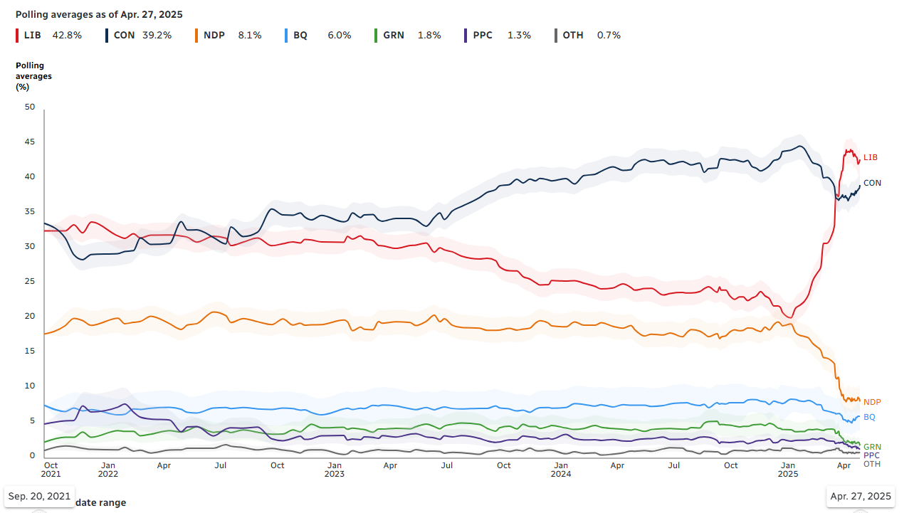 Pre-election polling results from April 27 indicate that the Liberal Party, led by the former Governor of the Bank of England, could gain a convincing win over its Conservative rivals.