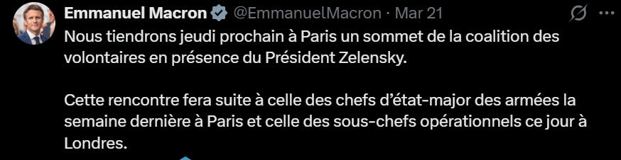 France will host the ‘Coalition of the Willing’ summit in Paris on March 27 to bolster support for Ukraine. Discussions are expected to center on military, humanitarian, and diplomatic assistance. The French president made the announcement on X on March 21.