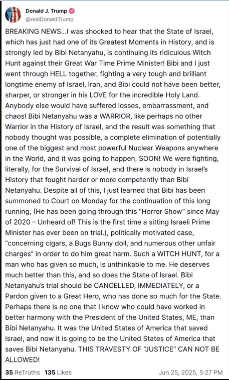 Trump has argued that the trial interferes with ongoing Gaza ceasefire talks and diplomacy with Iran, urging that it either be canceled or that Netanyahu be pardoned. The president made the statement in a lengthy post on Truth Social: