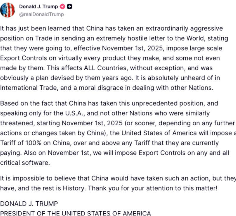 In the United States, trade tensions with China escalated after President Donald Trump announced sweeping 100% tariffs on all Chinese exports, effective November 1. The announcement followed Beijing’s tighter restrictions on rare earth materials and magnets that Washington cast as economic coercion. The U.S administration simultaneously expanded export controls to cover critical software and advanced technology bound for China, targeting areas such as AI design tools and semiconductors.