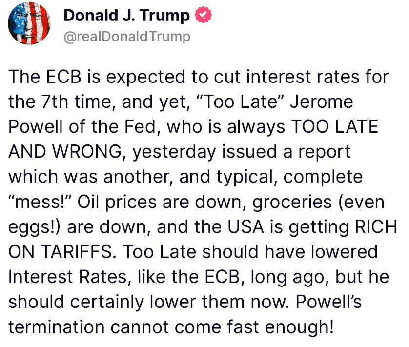 U.S. President Donald Trump has intensified his criticism of Federal Reserve Chair Jerome Powell, demanding immediate interest rate cuts and declaring Powell’s “termination cannot come fast enough.” In a Truth Social post and Oval Office remarks, Trump taunted Powell as “always TOO LATE AND WRONG,” citing falling oil prices and claiming tariffs are enriching the U.S. He contrasted the Fed’s inaction with the ECB’s seventh rate cut.