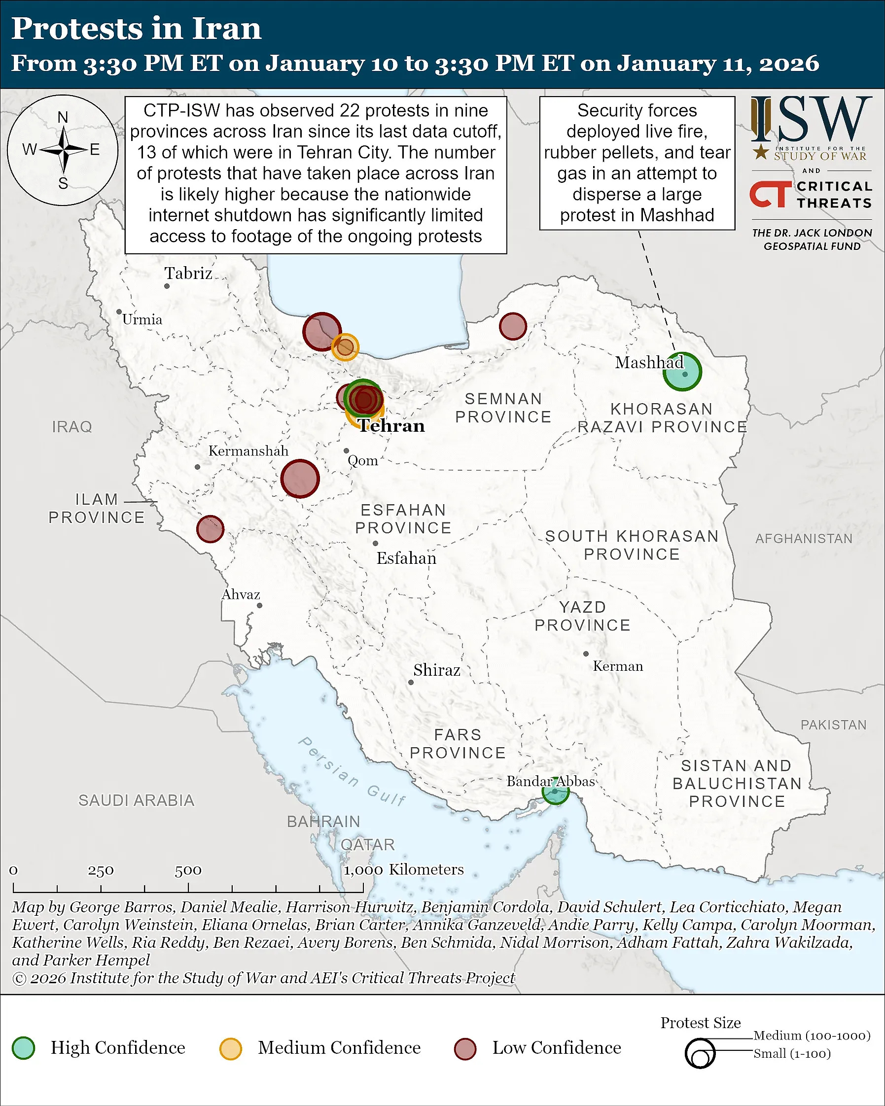Meanwhile, the Iranian regime is in “survival mode.” At least 116+ are dead and 2,600+ detained in 15 days of protests, as security forces have been overwhelmed and are reportedly retreating from multiple cities. Supreme Leader Khamenei and other members of his circle, according to multiple credible reports, are planning an escape to Moscow if the situation deteriorates and the regime collapses. Prediction markets are pricing regime change by year-end at 56%.